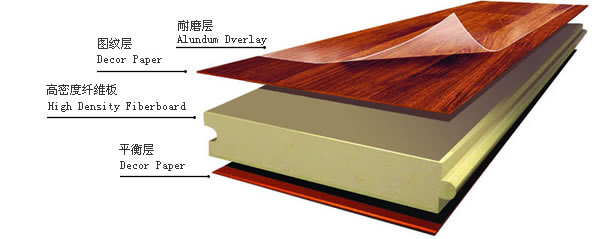 4) 平衡層:厚度約等于耐磨層加裝飾層,起防潮和穩(wěn)定作用,使地板在加工和使用過(guò)程中受力均勻。